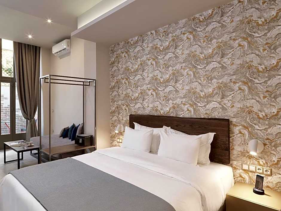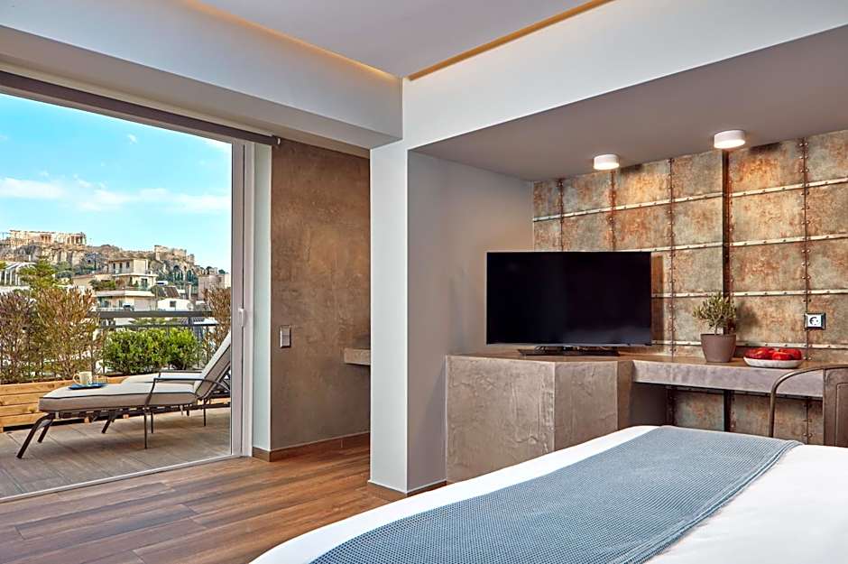 Fitted with marble walls and an industrial-style wallpaper, this deluxe suite opens to a private, spacious balcony with stunning views of Acropolis and sun loungers.